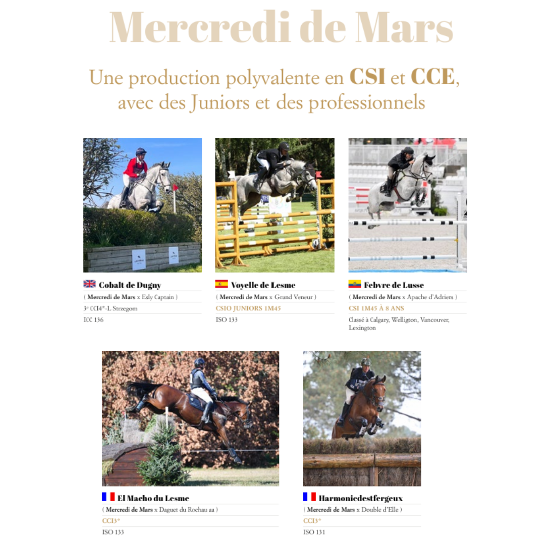" Un pedigree exceptionnel : Carthago couplé à la sœur de Quidam de Revel. Gagnant en CSI, Grand National et GP PRO 1m50. Ses produits sont faciles avec du look et une excellente locomotion. "
