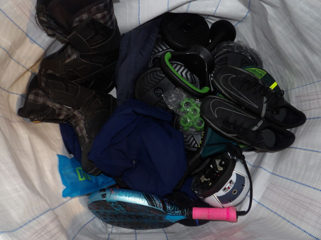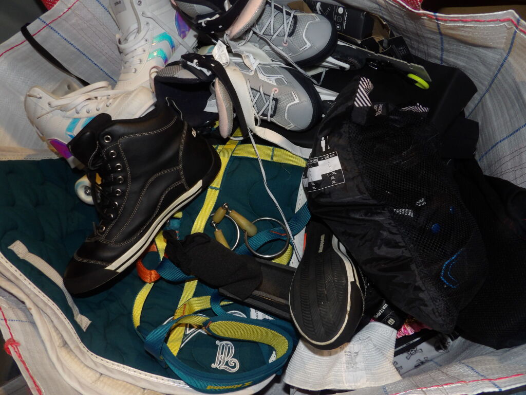 1/2 Palette de 60 pièces d'articles de sport - Boxe - Padel - Fitness - Patins à glace - Foot - Velo - Equitation etc...d'occasion et Neufs