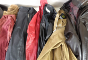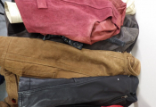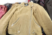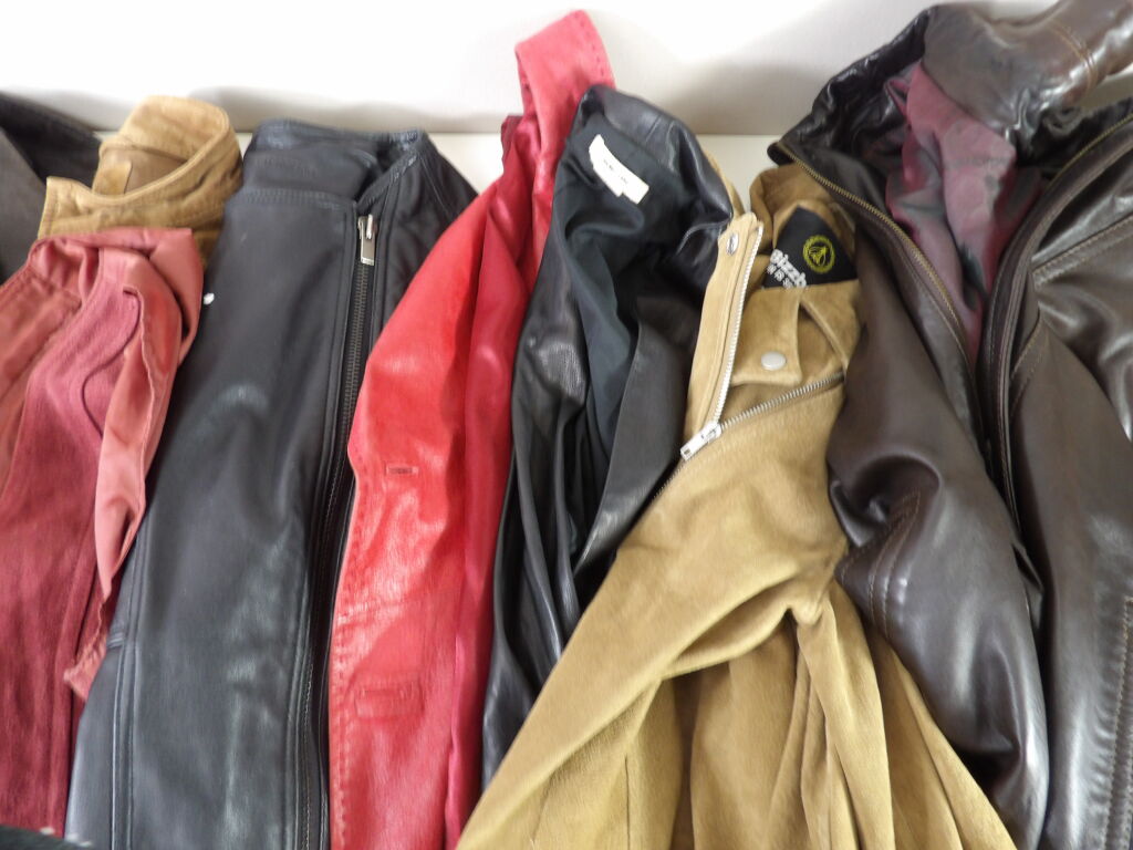13 vêtements dont 12 en cuir d'occasion divers états divers tailles, divers marques dont Helmut Lang et une pièce en fourure (lapin ?)...