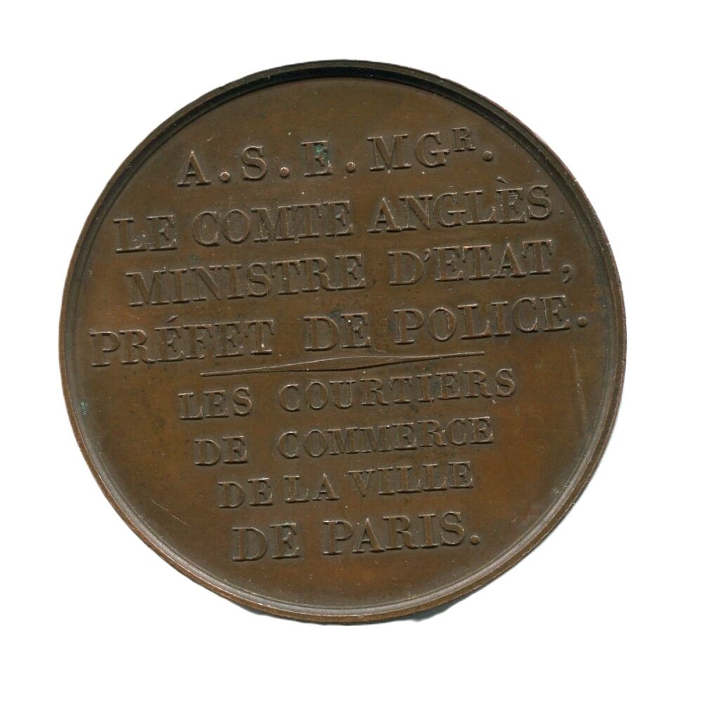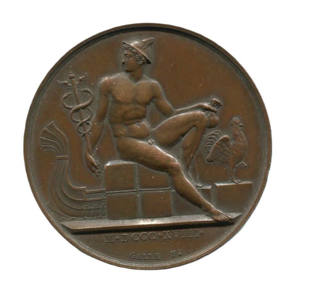 1818 - MEDAILLE des " COURTIERS de COMMERCE de la ville de PARIS, HOMMAGE à " A.S.E. MGr LE COMTE ANGLES ( * ) / MINISTRE D'ETAT : PREFET de POLICE ". - Avers : Mercure tenant un caducée et une bourse, assis sur un colis, proue de bateau au second plan, à droite coq chantant ; à l'exergue : M.D.XVIII, signature médailleur Galle. Bronze - 41 mm - 40 grammes.