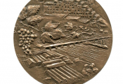 AMBOISE (37) - médaille de table ronde 68 mm - 173 grammes - Frappe Monnaie de Paris, bronze poinçon corne 1977 . - OEuvre haut relief de Janine BOYER - 1935-2003, 1er grand prix de Rome 1963. Vue du château de face, prise depuis le fleuve - Au revers : grappe de raison et ses feuilles. Au centre la Loire, fleuve royal ; au premier plan bâtiments d'usine de Négron, au fond quartier de la Verrerie d' Amboise.