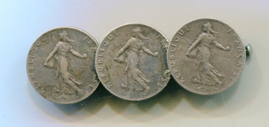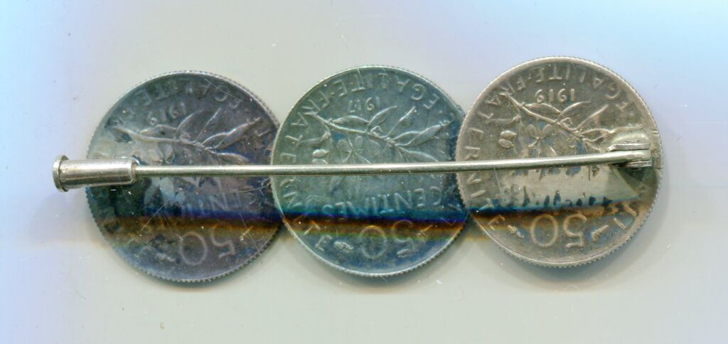 ARGENT - BIJOU MONETAIRE - BROCHE formée par trois pièces de 50 centimes de la Semeuse de Roty posée sur une épingle de sureté pour la fixation.