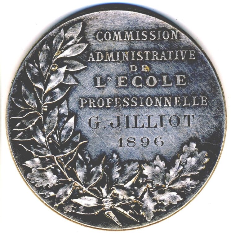 ARGENT - " CHAMBRE SYNDICALE du PAPIER " " École Professionnelle Reconnue d'Utilité Publique " - Femme assise, tête laurée, bras droit tendu et tenant une couronne, vers des usines au loin ; à sa droite presse à imprimer, à ses pieds livres.; à gauche ancre de marine & dame jeanne. OEuvre signée E. LEMOINE - Revers au-dessus de deux grandes palmes de chêne et laurier " commission administrative de l'école professionnelle ", attribution : G. JILLIOT 1896 - sur la tranche poinçons argent 950 et Minerve -