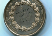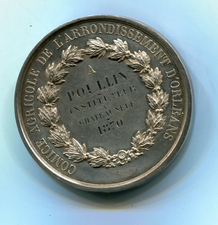 ARGENT - " COMICE AGRICOLE de L'ARRONDISSEMENT D' ORLEANS " grande médaille de récompense classe argent en argent 50 mm - " NAPOLEON III EMPEREUR ", tête laurée haut relief, profil à gauche, signé ODINE (sic au lieu Oudiné). - Revers : titre et attribution à l'intérieur d'une couronne de bouquets de feuilles de laurier : " A POULLIN Instituteur à Chateauneuf 1870 "- sur la tranche poinçons argent et abeille -