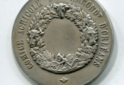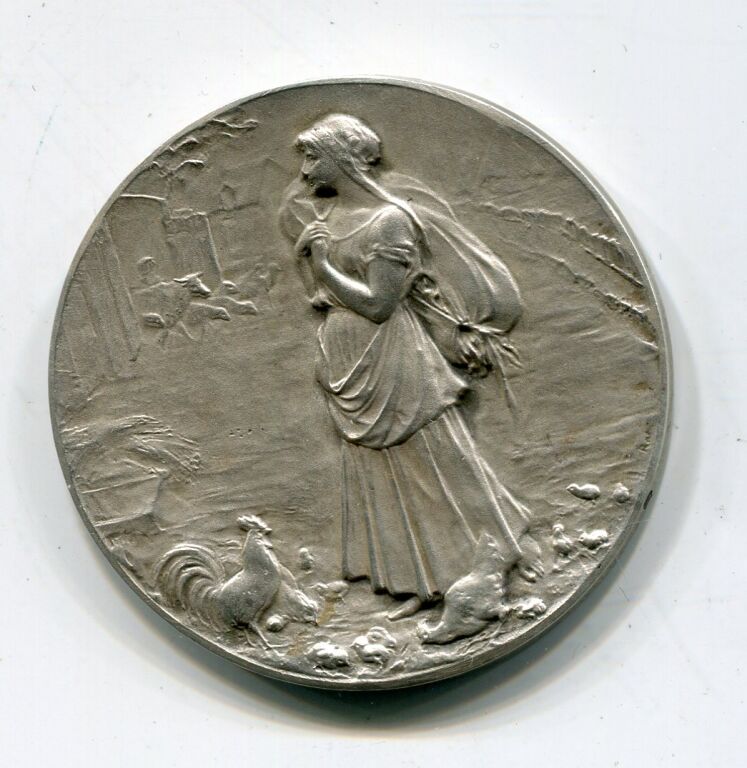 ARGENT - " COMICE AGRICOLE de L'ARRONDISSEMENT D' ORLEANS " médaille de récompense classe argent en argent 36 mm - intérieur de ferme avec basse-cour, au 1er plan femme debout portant un baluchon - Revers : couronne de végétaux et têtes de bœuf, cheval, mouton + charrue ; centre pour attribution. - sur la tranche poinçons argent et sanglier - 22,13 grammes - L/A n° 1137 - TTB