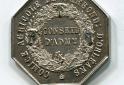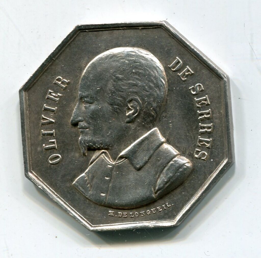 Jeton octogonal CONSEIL D'ADMINISTRATION en centre d'une couronne composée de symboles de l'agriculture : têtes de cheval, bœuf et mouron, charrue, épis de blé, vigne et laurier - à l'avers : OLIVIER DE SERRES ( * ) son buste de profil à gauche. Signature H. DE LONGUEIL sous le buste. - 31 mm - sur la tranche poinçons argent et abeille 1860/1879) - 12,70 grammes - L/A n° 1127. - TTB