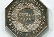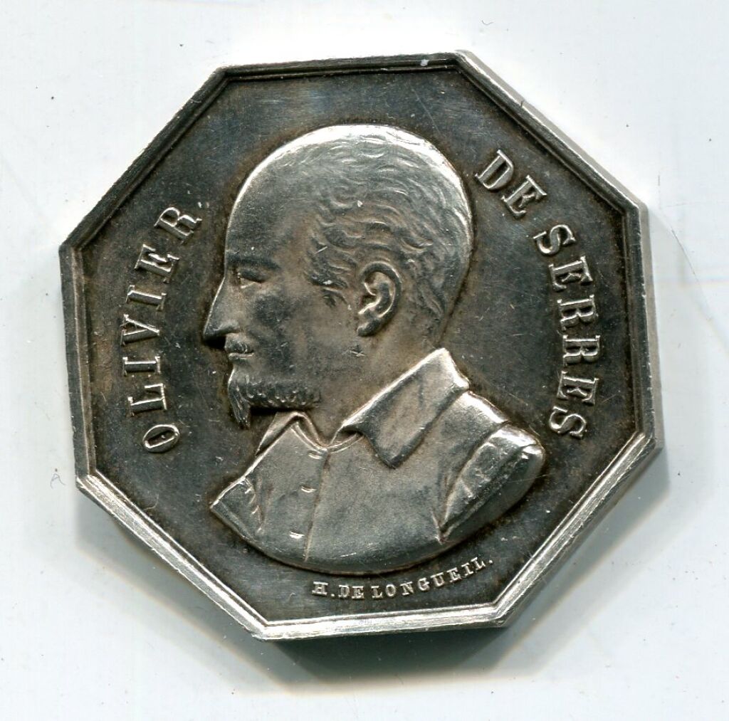Jeton octogonal CONSEIL D'ADMINISTRATION en centre d'une couronne composée de symboles de l'agriculture : têtes de cheval, bœuf et mouron, charrue, épis de blé, vigne et laurier - à l'avers : OLIVIER DE SERRES ( * ) son buste de profil à gauche. Signature H. DE LONGUEIL sous le buste. - 31 mm - sur la tranche poinçons argent et main indicatrice 1845/1860) - 13,41 grammes - L/A n° 1126. - TTB