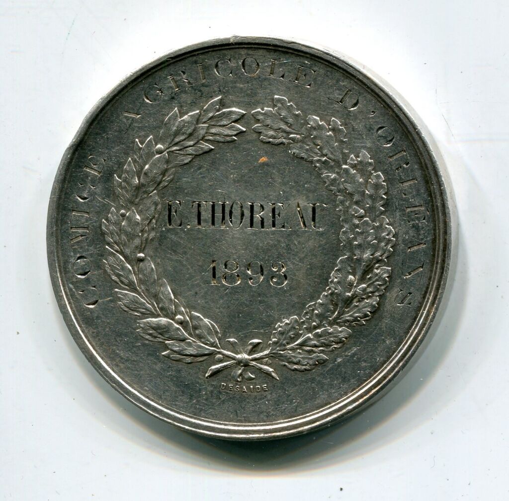 ARGENT - " COMICE AGRICOLE D'ORLEANS " - grande médaille classe argent en argent 45 mm - blason d'orléans couronné entre 2 palmes de chêne et laurier - Au revers, attribution dans une couronne de laurier et chêne : " R. THOREAU 1893 ". - sur la tranche poinçons argent et corne - 47,42 grammes - TTB