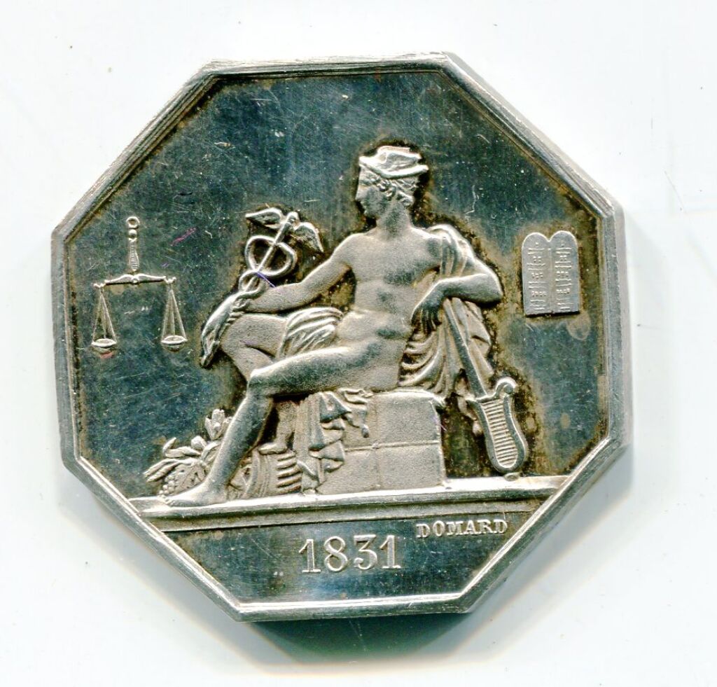 Jeton de présence, Mercure assis profil à gauche tenant caducée du commerce ; à droite tables de la Loi ; à gauche balance - date à l'exergue 1831 - signé Domard.