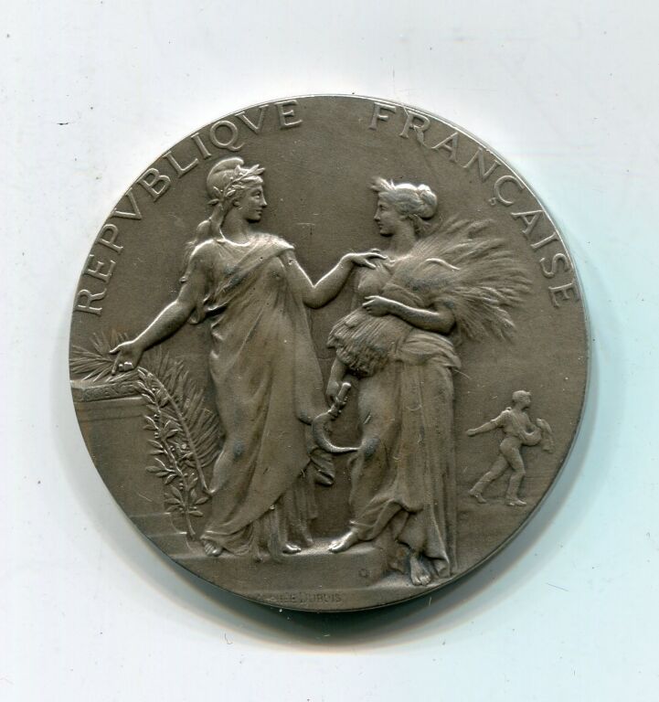 ARGENT - ENSEIGNEMENT AGRICOLE - médaille classe argent en argent 1er titre 950 millièmes - "République Française", le science debout tête laurée, la main droite posée sur un livre, pose la main droite sur l'épaule d'un agricultrice avec gerbe de blé sur l'épaule ; au fond semeur ; œuvre signée Alphée DUBOIS - Revers : " Ministère de l'Agriculture ", écu sur gerbe de blé, feuilles de vigne et grappes de raisin nouées par un ruban légendé "Science - Labeur "- sur la tranche poinçons argent 1 et corne- 40 mm - 36,88 grammes - TTB