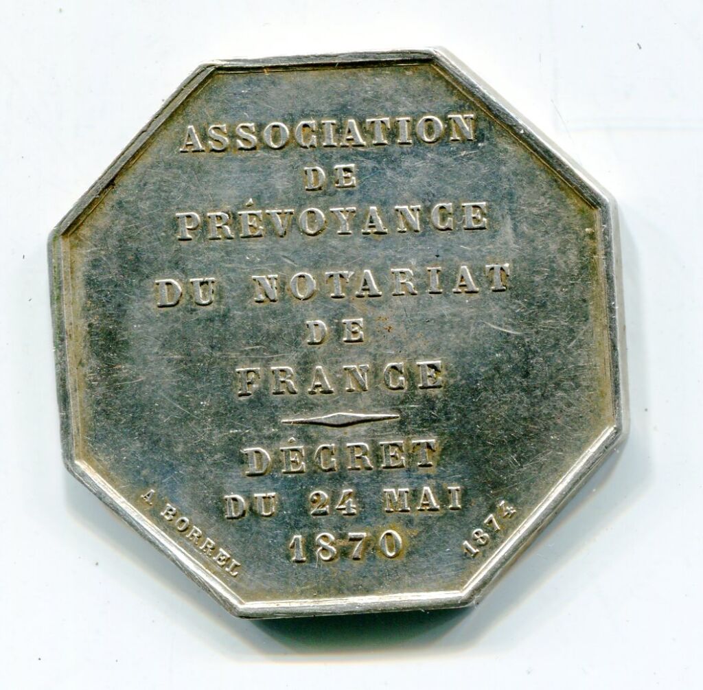 ARGENT - Jeton de présence du NOTARIAT - Texte dans le champ : " Association de Prévoyance du notariat de France / Décret du 24 mai 1870 ", signé Alfred BORREL 1871.