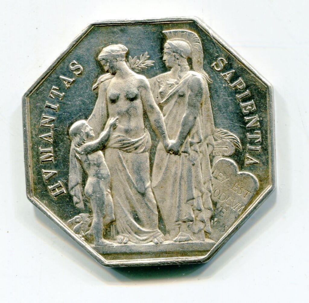 Avers : "HVMANITAS SAPIENTIA (la sagesse humaine), 2 déesses antiques et enfant nu. sur la tranche poinçons argent et corne - octogonal 35,5 mm - 21,83 grammes - SUP