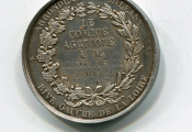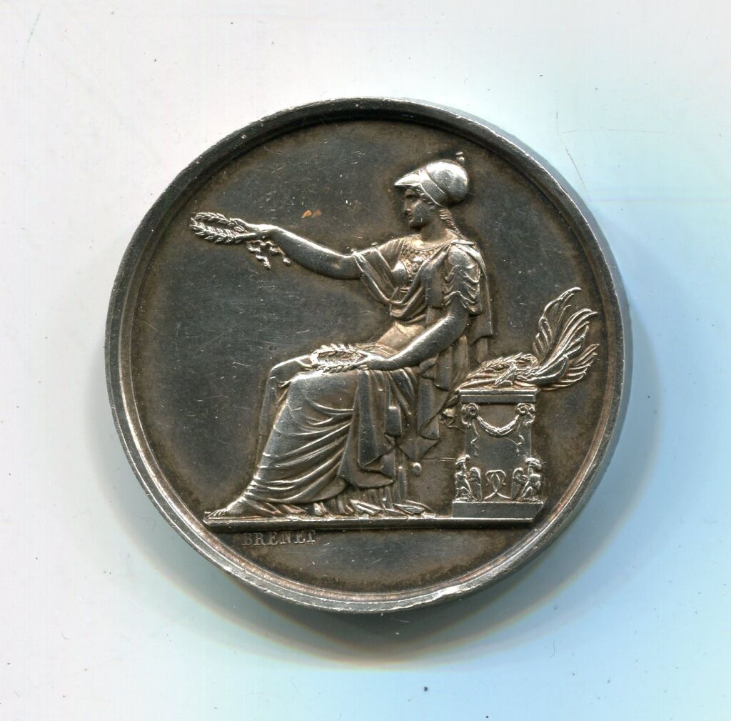 OEUVRE de BRENET : femme drapée, coiffée du casque corinthien, assise à gauche, offrant une couronne de laurier de la main droite, stèle avec couronnes et palmes sur un socle à l'arrière- Revers : titre et en centre d'une couronne de feuilles de chêne et d'oliver, attribution : à M. COLAS de BROUVILLE 1846 " - Sur la tranche poinçons argent et proue de navire. - 37,99 grammes - qq petits chocs TTB - L/A n° 1152
