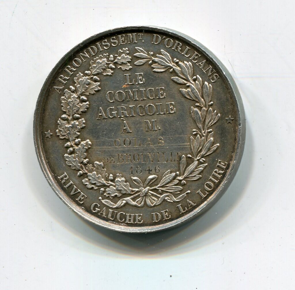 ARGENT - " LE COMICE AGRICOLE RIVE GAUCHE de la LOIRE, arrondissement d'Orléans " - RARE MEDAILLE classe argent en argent 40,5 mm -