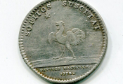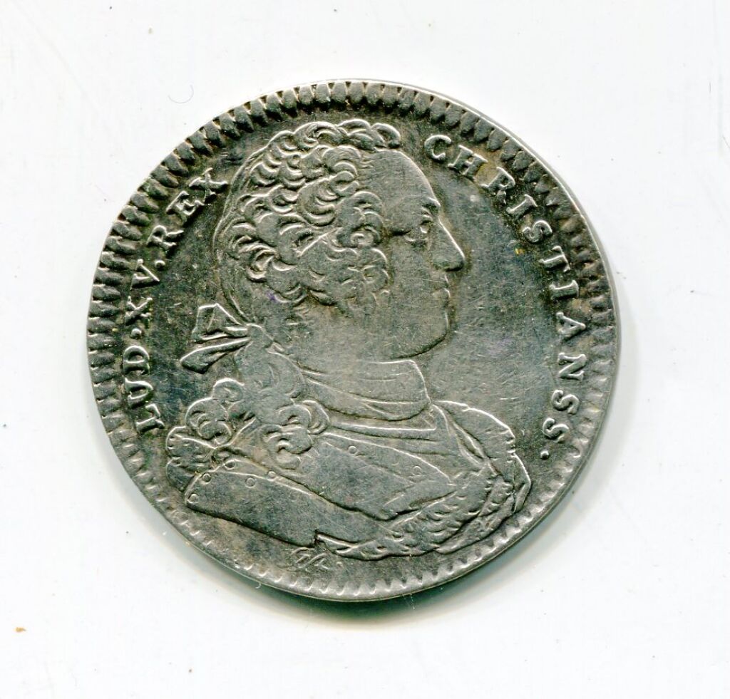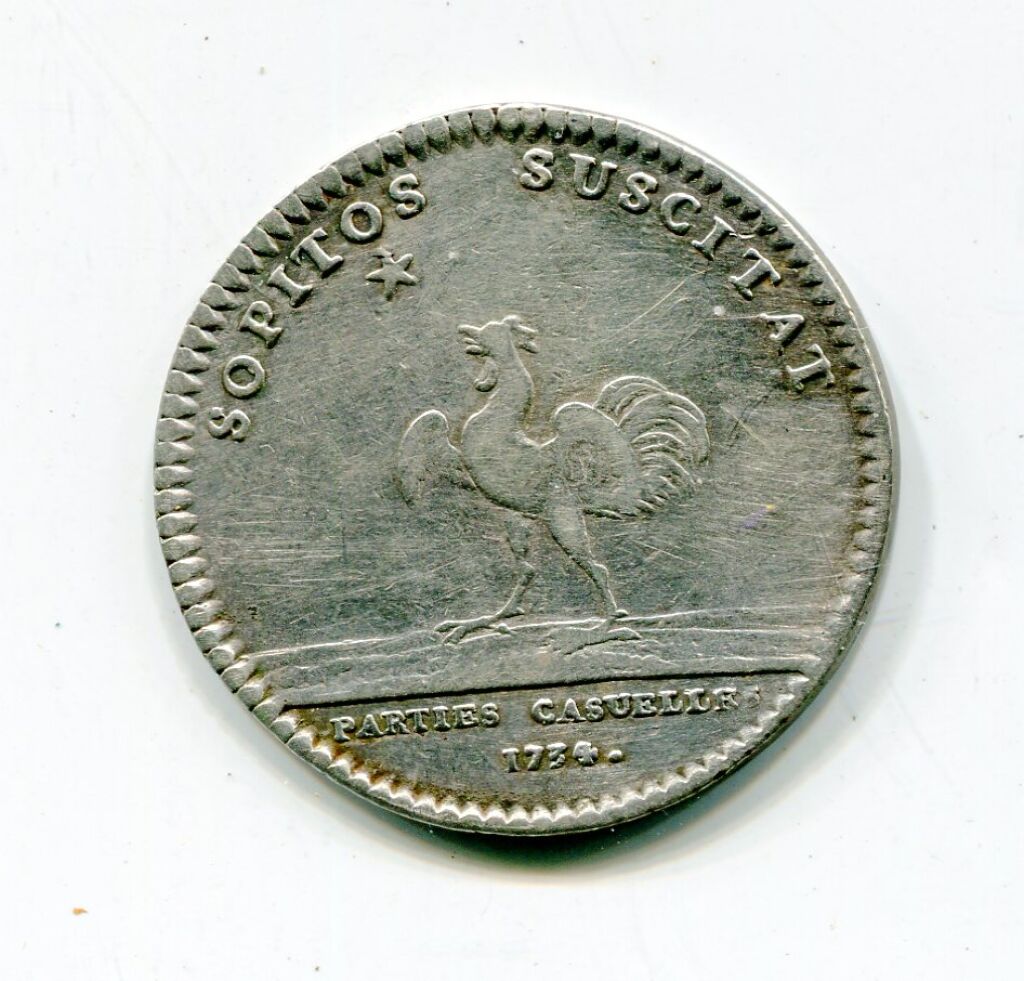 SOPITOS SUSCITAN (ils réveillent ceux qui dorment), coq ailes déployées, debout à gauche, fixant l'étoile du matin. - Avers : LUD. XV. REX. CHRISTIANSS, buste du roi cuirassé, cheveux noués, profil à droite ; signature JCR sous le buste.