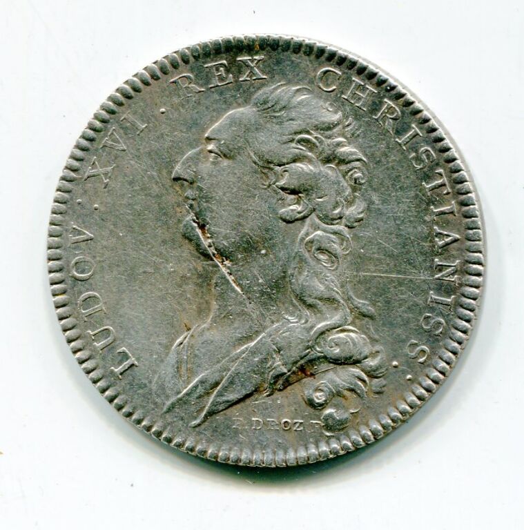 ARGENT - LOUIS XVI - ROUEN, ACADEMIE des SCIENCES - Jeton de présence " TRIA LIMINA PANDIT " (il ouvre trois portes), Minerve couchée à gauche au milieu d'objets d'art et instruments scientifiques montre de la main droite un temple placé sur un mont - à l'exergue : "ROTHOM. SCIEN. LITT ET ART ACAD." - gravure signée ALLAIS.- Revers : LUDOV XVI REX CHRISTIANISS buste du Roi drapé, profil à gauche, signé JP DROZ (défaut de frappe d'époque, balafre) - rare, frappe monnaie - 30 mm - 8,40 grammes - TB / TTB