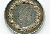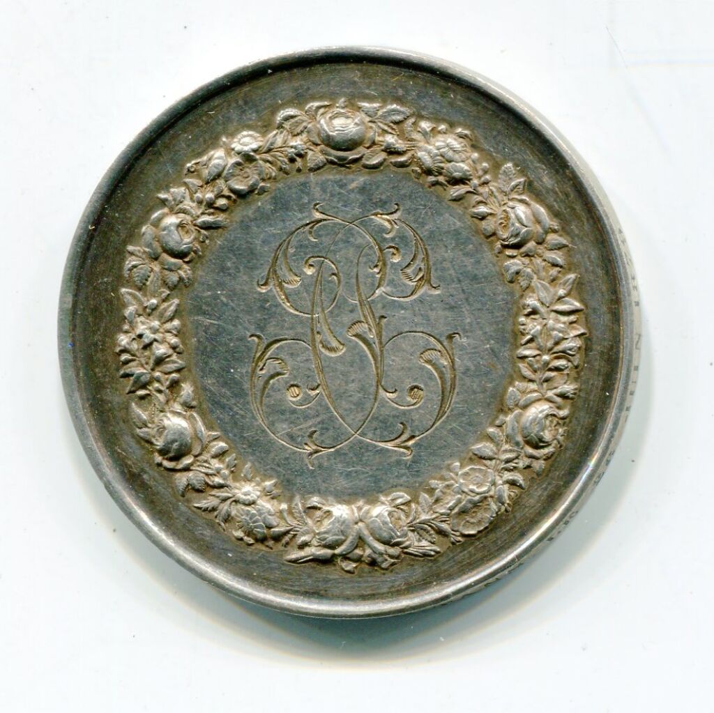 Revers : dans une couronne de roses, monogramme P C - Attribution sur la tranche : LOUIS POISSON - EMELIE COUTANS le 26 JUIN 1879 " - poinçons argent et abeille.