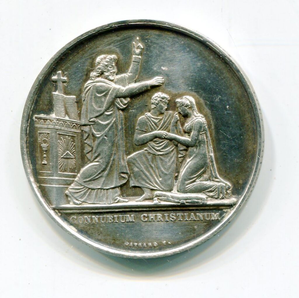 ARGENT - MEDAILLE de MARIAGE - au modèle " MARIAGE CHRETIEN é, couple vêtu à l'antique agenouillé devant le prêtre qui les bénit, à l'arrière autel avec croix, légende à l'exergue :"CONNUBIUM CHRISTINANUM " - Modèle du sculpteur CATRARD.