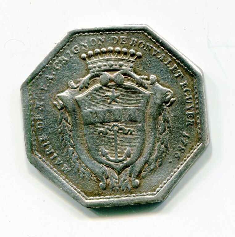 ARGENT - ORLEANS - JETON de MAIRE - " MAIRIE DE Mre F.A. CRIGNON DE BONVALET ECUYER 1786", ses armes couronnées entourées de 2 palmes - Revers : ME VINDICE LILIA FLORENT en légende circulaire. AURELLIA à l'exergue - En centre la Pucelle assise de face, cordelette autour de la taille, tenant épée de la main droite, la gauche appuyée sur le blason d'Orléans, faisceau de drapeau à l'arrière. (4 hampes)
