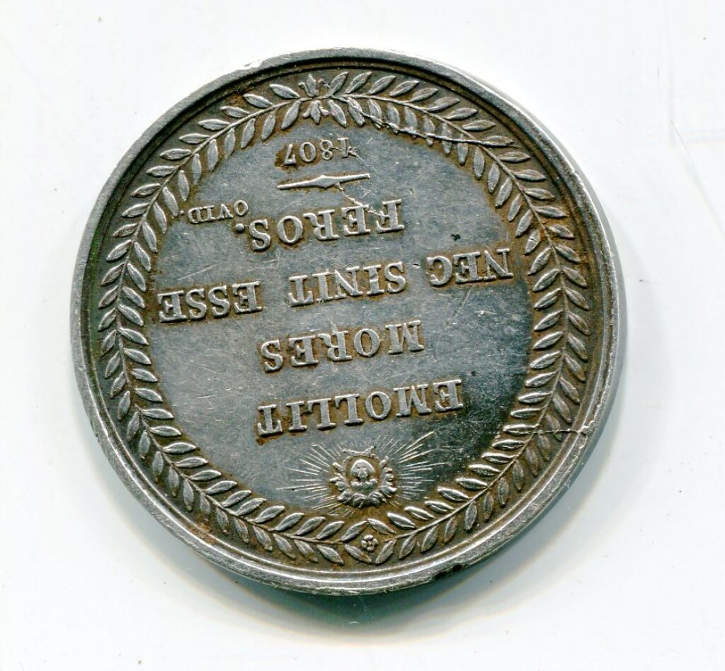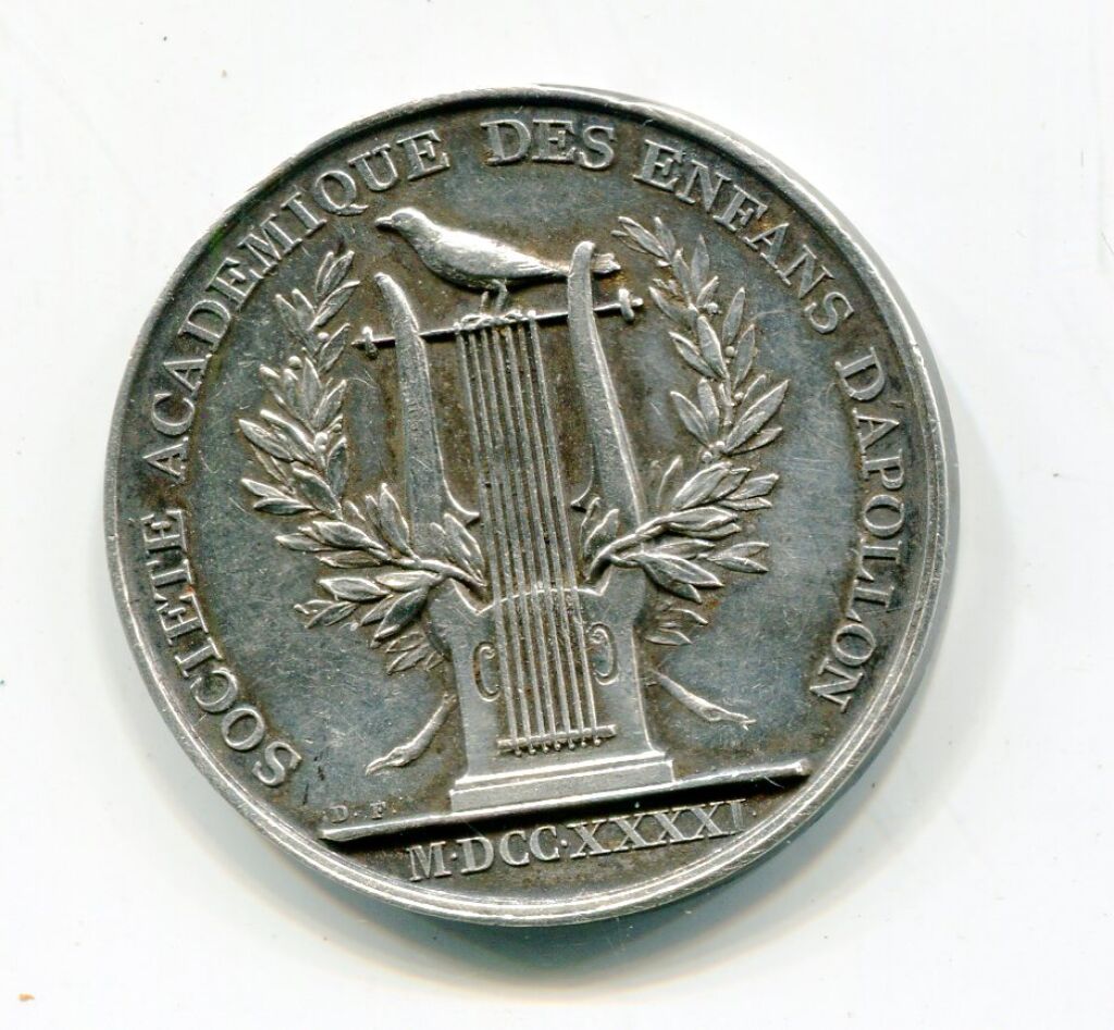 Très rare Médaille de récompense scolaire ou académique, lyre antique de face sur 2 rameaux de laurier entrecroisés, un oiseau regardant à gauche posé sur les cordes ; à l'exergue MDCCXXXXI, signature D.F. - Revers, sous un soleil : EMOLLIT MORES NEC SENIT ESSE FEROS. OVID 1807 (une solide culture dans les arts libéraux adoucit le caractère et ne lui permet pas d'être sauvage, métamorphoses d' OVIDE n° 1807), texte dans une couronne de feuilles de laurier. - 30 mm - 9,39 grammes - TTB