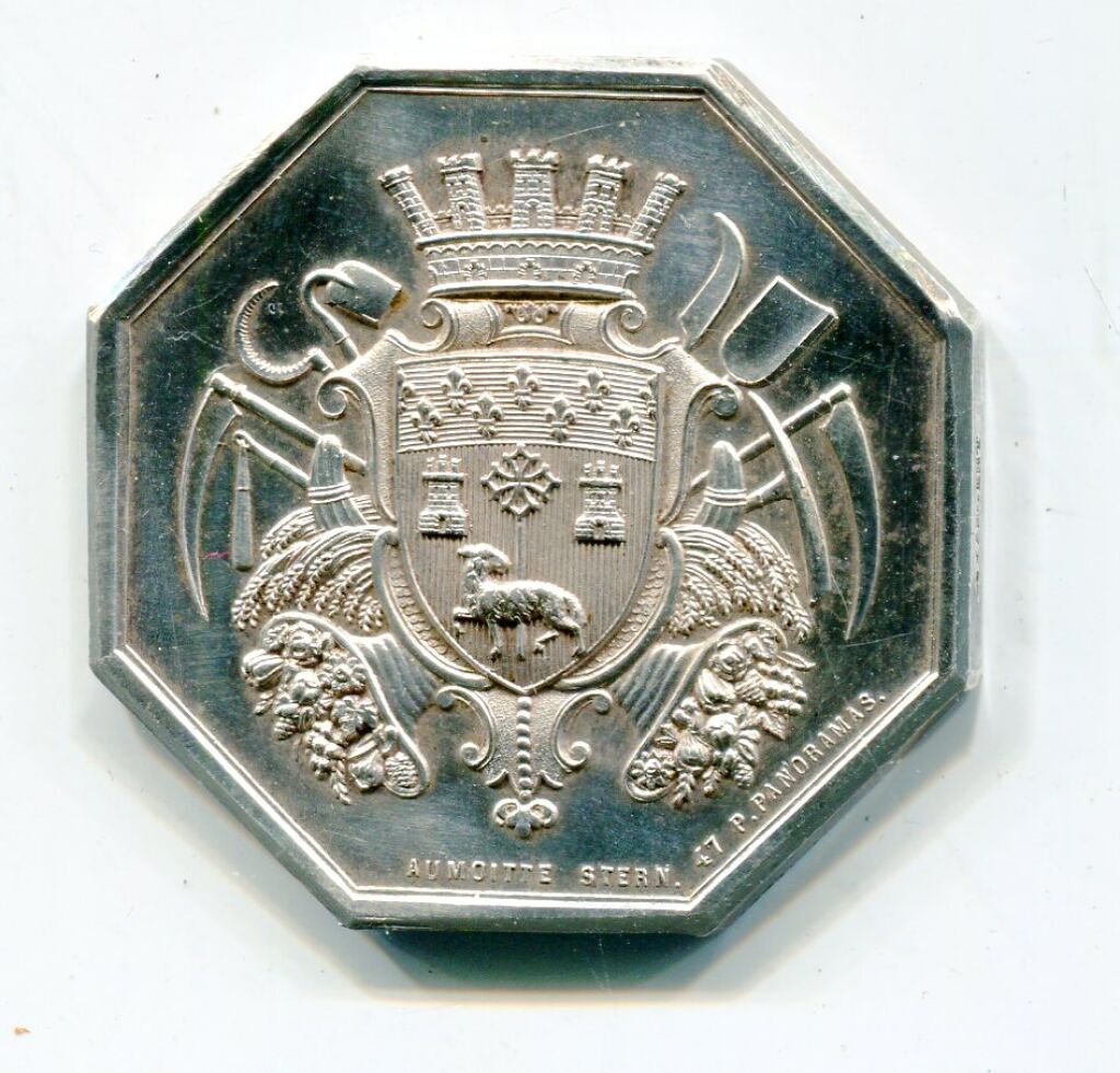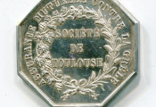 ARGENT - "SOCIETE de TOULOUSE / ASSURANCE MUTUELLE CONTRE LA GRELE", jeton de présence en argent 840 millièmes - blason de Toulouse couronné sur outils agricoles (faux, serpe, bêche, pelle, pioche …), gerbes de blé, cornes d'abondance remplies de fleurs - à l'exergue signé AUMOITTE et STERN - au revers titres en pourtour et à l'intérieur de deux palmes d'épis de blé et feuilles de vigne et grappes de raisin.