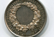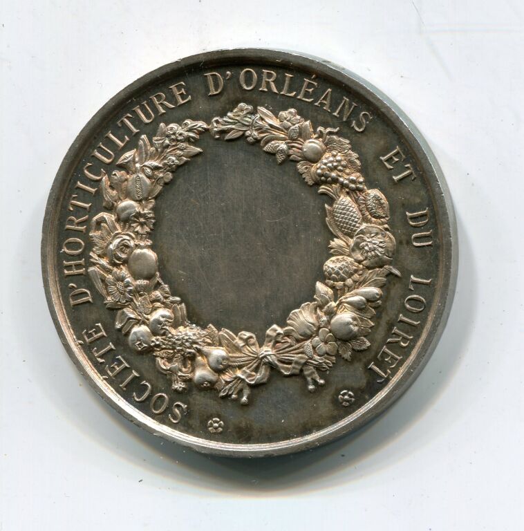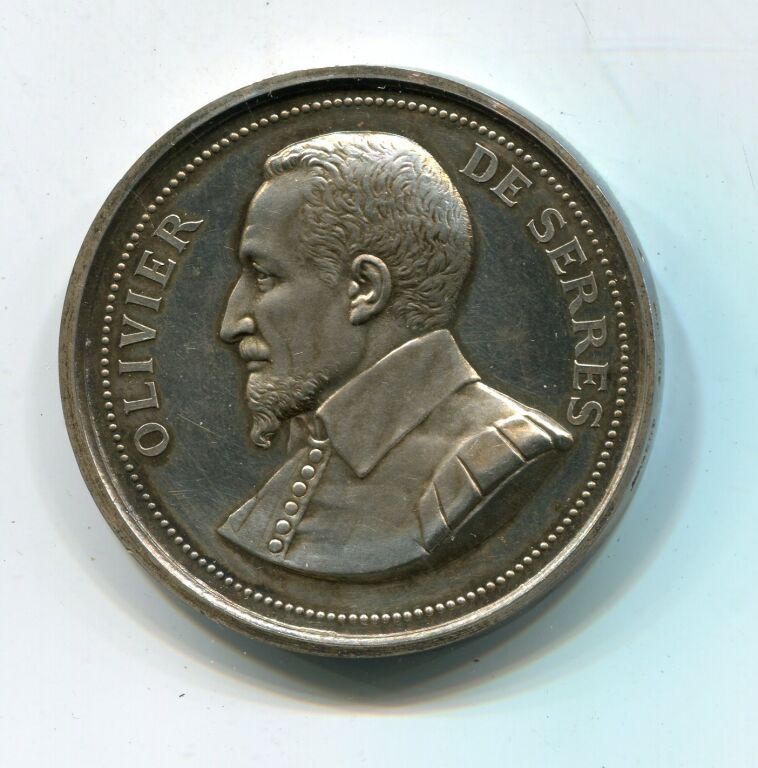 ARGENT - " SOCIETE D'HORTICULTURE D'ORLEANS et du LOIRET ", Grande médaille classe argent en argent 950 millièmes, couronne de fruits, fleurs et céréales, centre pour attribution.- " OLIVIER DE SERRES " épais listel, cercle de grenetis, en centre son portrait haut relief profil à gauche - sur la tranche poinçons argent 950 et tête de Minerve.