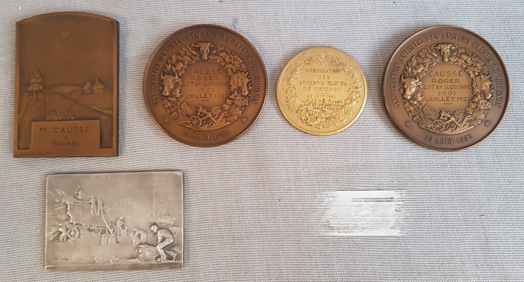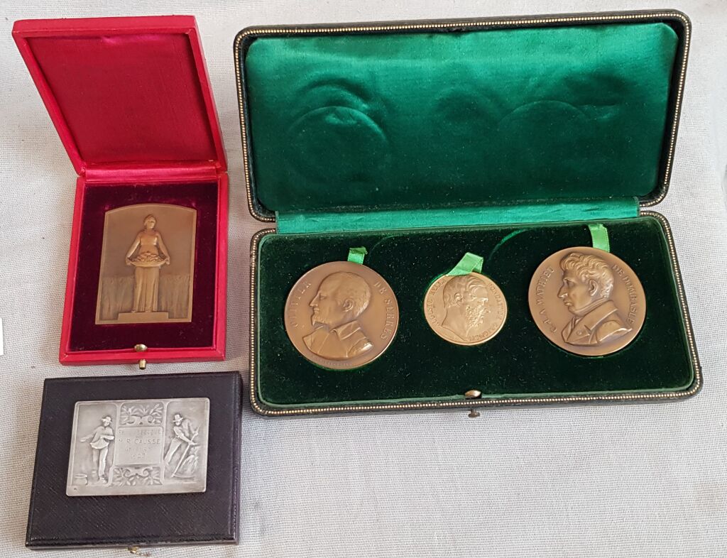 - 3 médailles dans un joli coffret collectif, cuir décoré, bois & velours vert à la forme de " l' association amical des anciens élèves de Grignon, chaque médaille au nom de René Caussé et mention " 1901 - Juillet 1922 " :