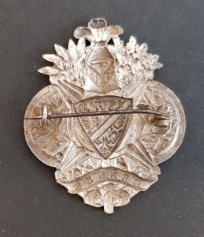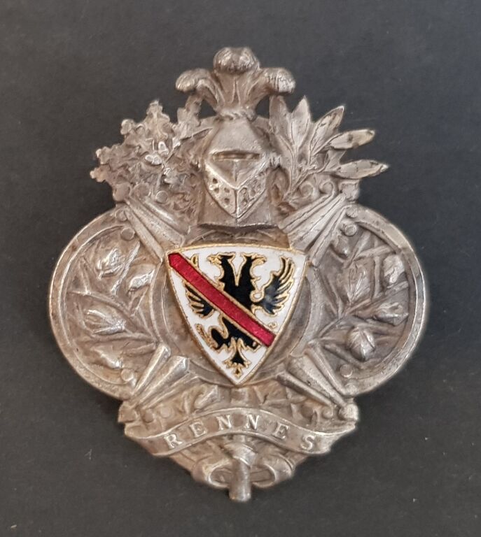 Métal argenté estampé, en forme de bouclier de tournoi. Le fond est constitué de fleurs de lis, l' exergue comporte " RENNES " dans une banderole, le haut est constitué d' un heaume entouré de feuilles de chêne et de laurier. En centre posé sur une étoile à 4 branche est posé, en émail grand feu, l' écu des DU GUESCLIN : aigle bicéphale noir entouré d' un filet or avec en biais trait rouge.