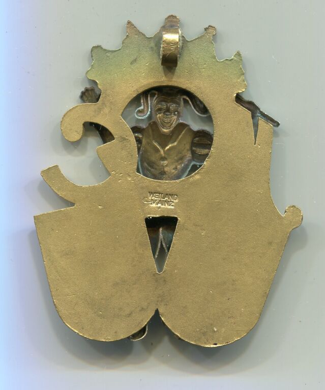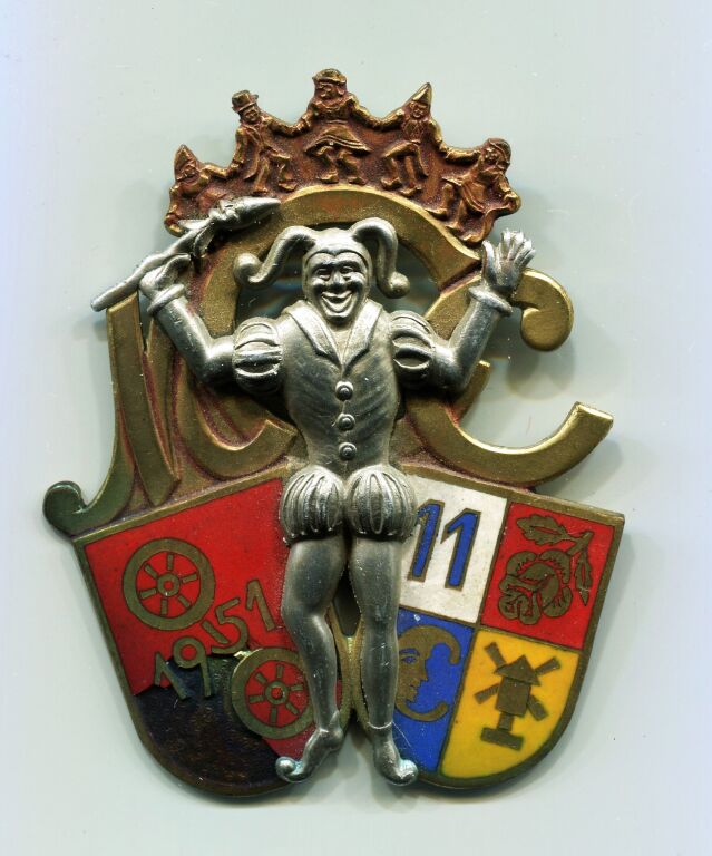 CARNAVAL de MAYENCE 1951 / ALLEMAGNE ( * )- Grande médaille / Insigne du comité - 60 x 49 mm - EMAIL GRAND FEU multicolore - En centre carnavaleux en pied sur lettres MCC, au-dessus farandole d'enfants, à gauche blason de Mayence, à droite blason du comité - Marquage fabricant au dos : WEILAND MAINZ. - 27,41 grammes. -