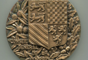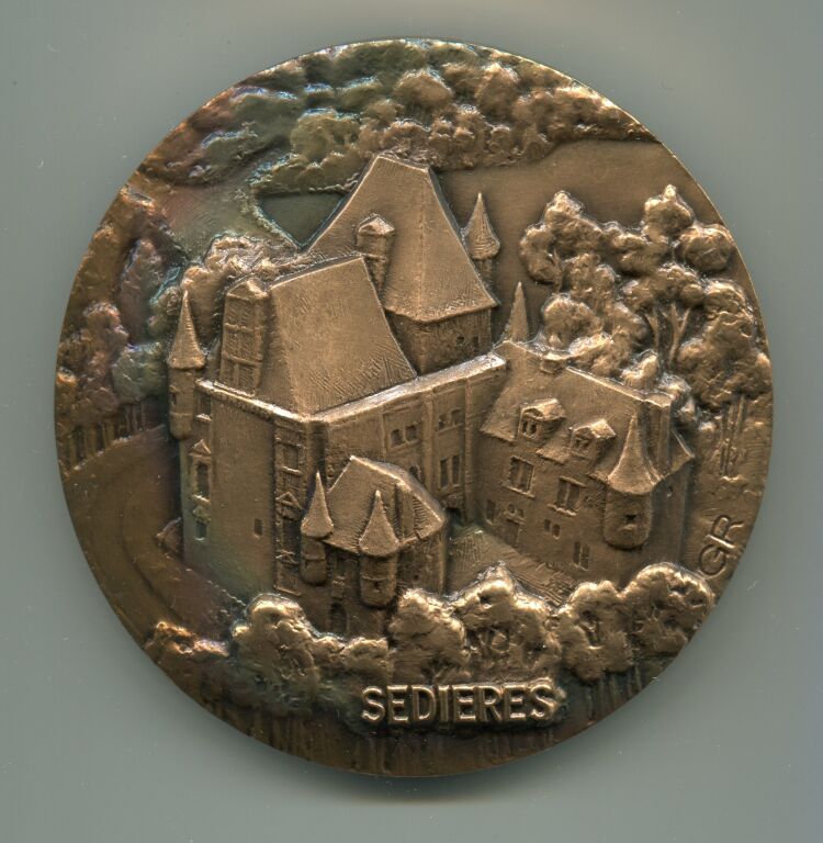 CLERGOUX (19), médaille de table du CONSEIL GENERAL de la CORREZE.- Bronze poinçon corne, 80 mm - 402 grammes - Gravure haut relief du sculpteur haut viennois " G R ", blason de Corrèze posé sur glands & feuilles de chêne / bleuets - Revers : vue cavalière haut relief du château de SEDIERES - SUP