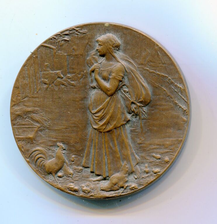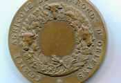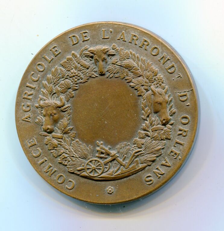 " COMICE AGRICOLE de L'ARRONDISSEMENT D' ORLEANS " grande médaille de récompense classe bronze en bronze 50 mm - intérieur de ferme avec basse-cour, au 1er plan femme debout portant un baluchon - Revers : couronne de végétaux et têtes de bœuf, cheval, mouton + charrue ; centre pour attribution - sur la tranche poinçons bronze et corne - 72,89 grammes - L/A n° 1141 a - TTB