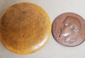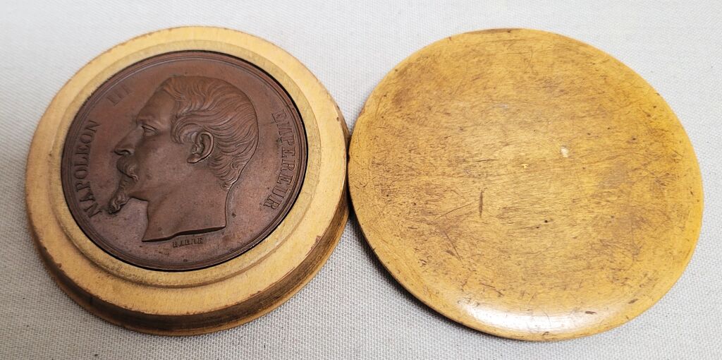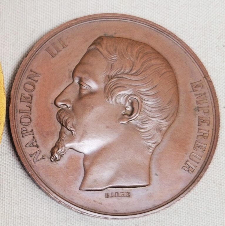 " COMICE AGRICOLE de L'ARRONDISSEMENT D' ORLEANS " grande médaille de récompense classe bronze en cuivre 50 mm - " NAPOLEON III EMPEREUR ", tête nue, haut relief, profil à gauche, signé BARRE. - Revers : titre et couronne de bouquets de feuilles de laurier, intérieur pour attribution. : " sur la tranche poinçons cuivre et abeille -