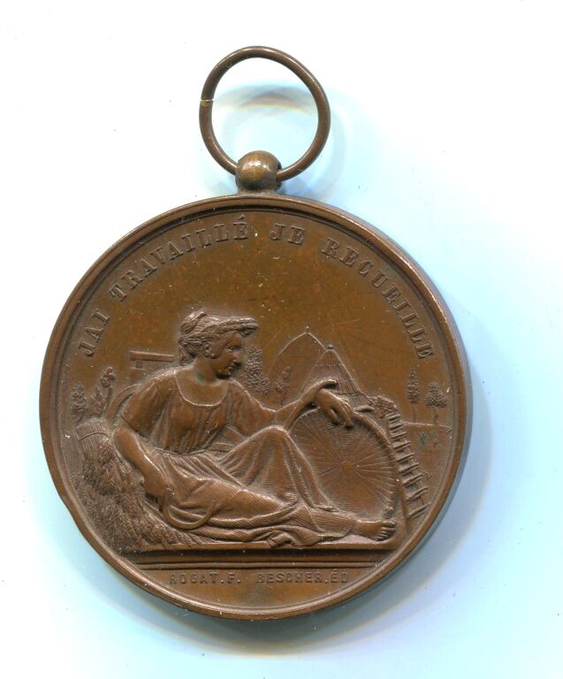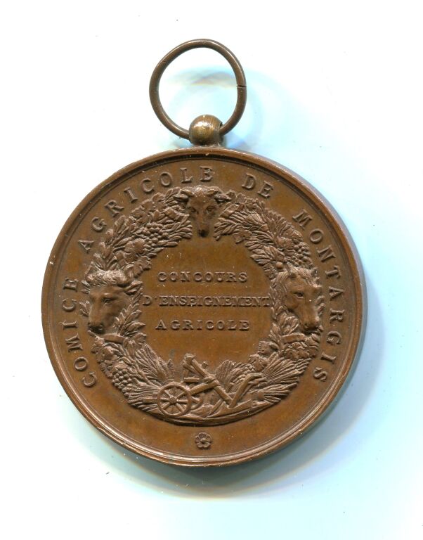 " COMICE AGRICOLE de MONTARGIS / CONCOURS D'ENSEIGNEMENT AGRICOLE", texte en centre de deux palmes de feuilles de chêne et de laurier, têtes de bœuf, cheval, mouton + charrue. - Revers : " J'AI TRAVAILLE / JE RECUEILLE, jeune femme assise tenant serpe de la main droite, ,main appuyée sur un panier à vanner ; au fond meules de paille - Médaille en cuivre 45 mm poinçon corne. - œuvre signée Rogat, Bescher ed -