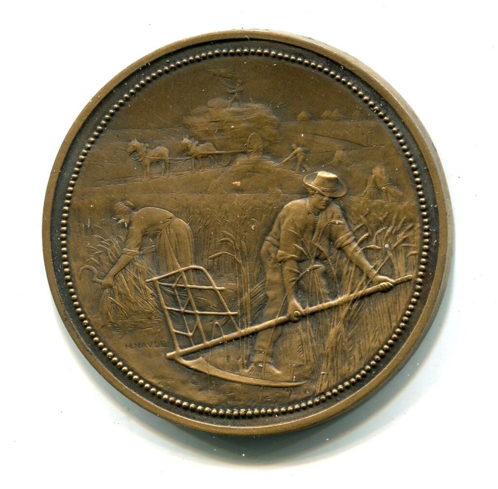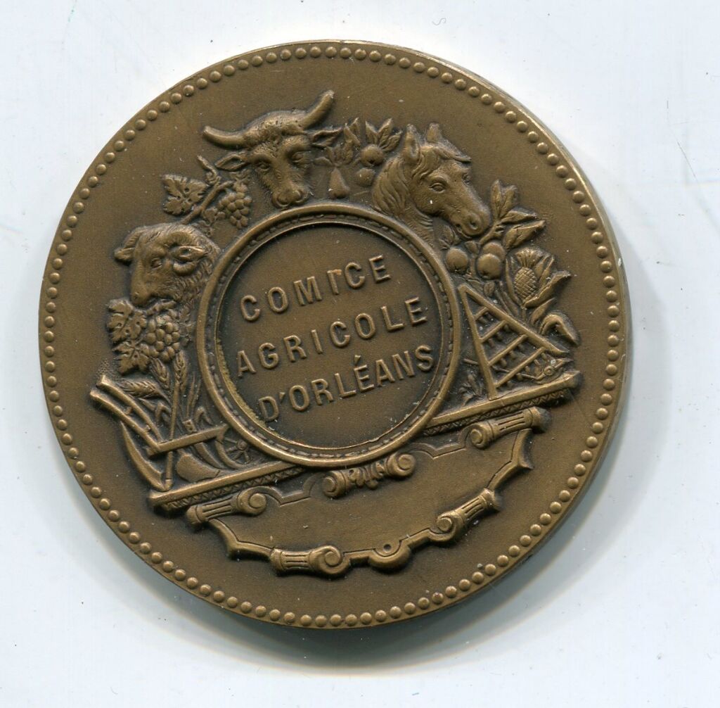 " COMICE AGRICOLE D'ORLEANS " - Scène de moisson , couple en action au milieu d'un champ de blé, charrette à chevaux au fond - Revers : décor sur un écu baroque : Têtes de cheval, bœuf, mouton, grappes de raisin, charrue et instruments agraires.