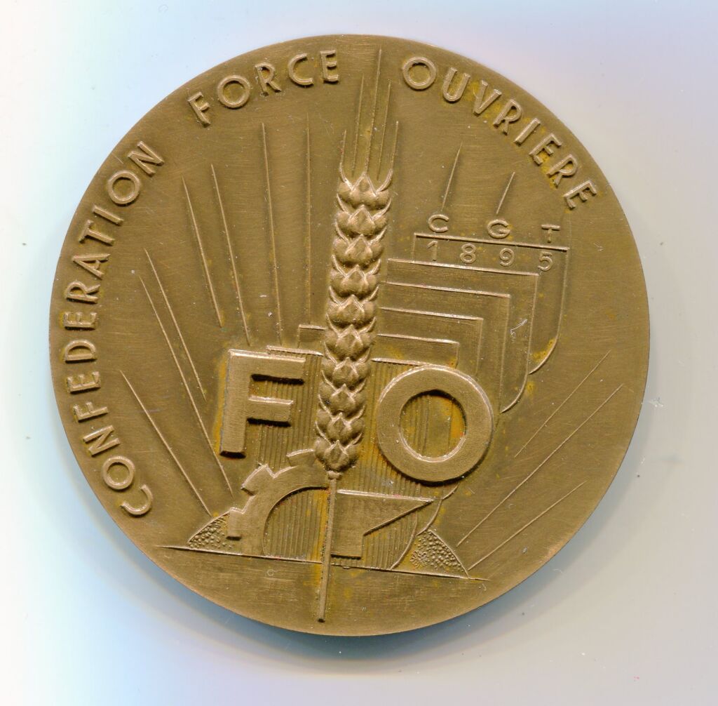 " CONFEDERATION FORCE OUVRIERE " - Médaille classe bronze en bronze. Épis de blé en centre sur soleil rayonnant et roue dentée - revers : couronne de 2 palmes d'olivier, centre pour attribution - sur la tranche poinçon corne et bronze, date de frappe 1974.