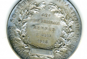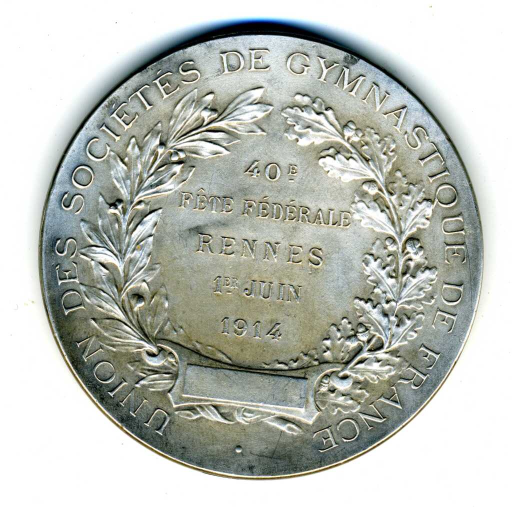 "ENCOURAGEMENT AU TIR - 40e FETE FEDERALE RENNES 1er juin 1914" - UNION des SOCIETES de GYMNASTIQUE de France " - grande médaille classe argent en bronze argenté, la France en toge, coiffée du bonnet phrygien, tenant drapeau, bras droit tendu. Derrière elle une autre femme tient un parchemin légendé Patria et tend de la main droite une branche de laurier. A sa droite tireur agenouillé, à sa gauche tireur debout, œuvre signée G H - Revers : Titres intérieur/extérieur d'une couronne de palmes de laurier et chêne.