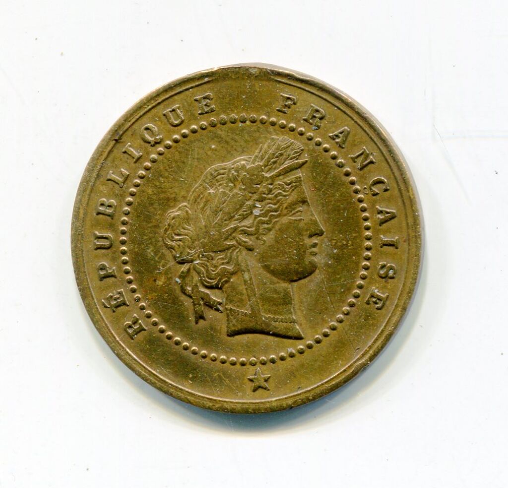 JETON TIRAGE AU SORT SERVICE MILITAIRE classe 1883 - ( * ) au module et à l'image de la dix centimes Cérès 3e République - "République Française", tête laurée de Cérès déesse des moissons profil à droite - Revers : "tirage au sort, classe 1883". - 2 soldats au garde à vous montent la garde de part et d'autre d'un rectangle, manuellement gravé n° 1 - au-dessus 2 palmes croisées, à l'exergue 2 clairons croisés.