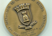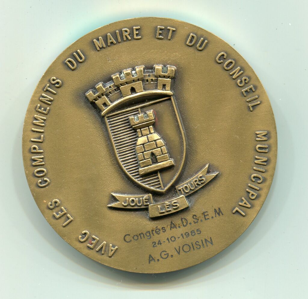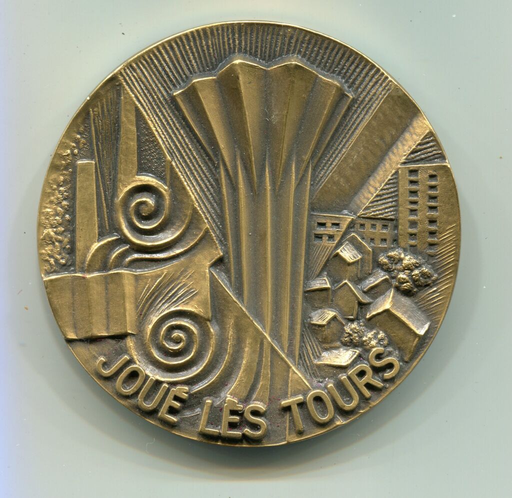 JOUE LES TOURS (37) - Médaille d'honneur de la ville et commémorative à l'occasion du congrès des agents territoriaux spécialisés des écoles maternelles. - Composition des ateliers Pichard de Saumur : vue moderne de ville avec centre bourg et immeubles, château d'eau et formes géométriques - Revers : en centre blason couronné de la ville ; en pourtour : "avec les compliments du maire et du conseil municipal". Sous le blason attribution : "Congrès A.D.S.E.M. 24 octobre 1985 A.G. VOISIN" - poinçon bronze sur la tranche -