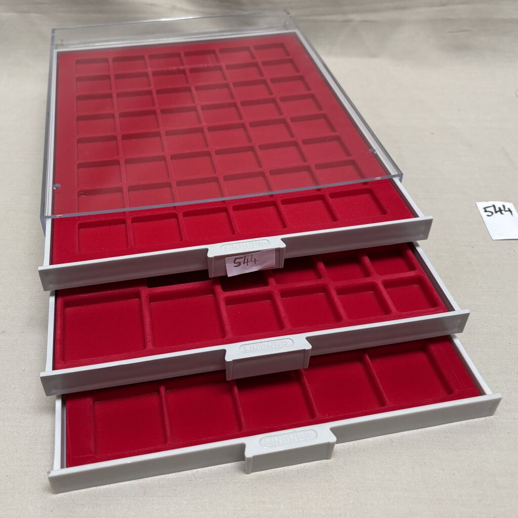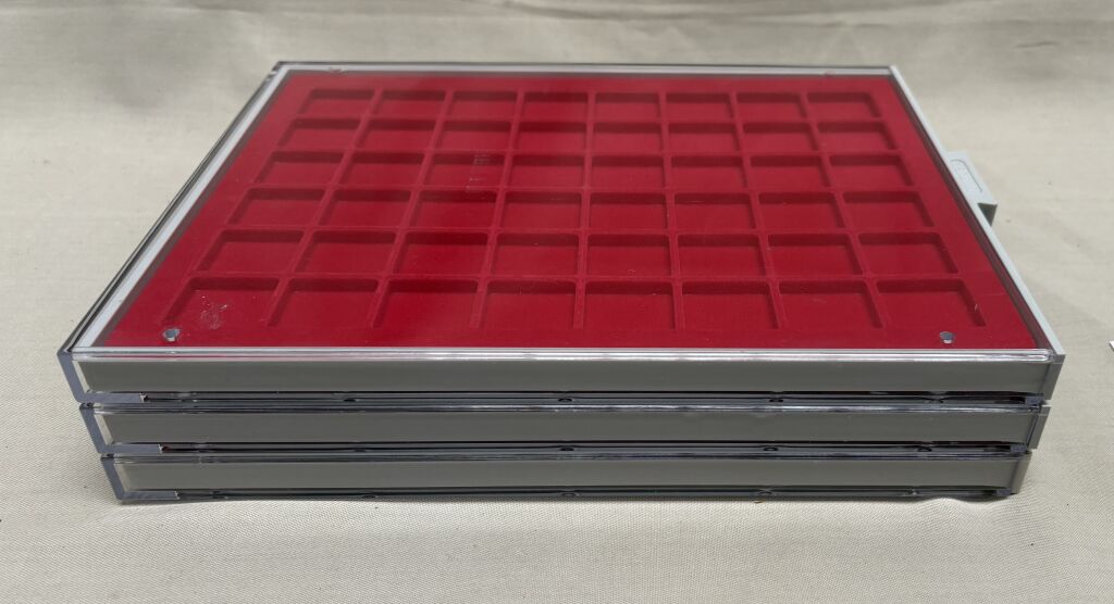 MATERIEL - BOX, de type Lindner ou Yvert & Tellier - Tiroirs empilables fonds rouges.