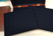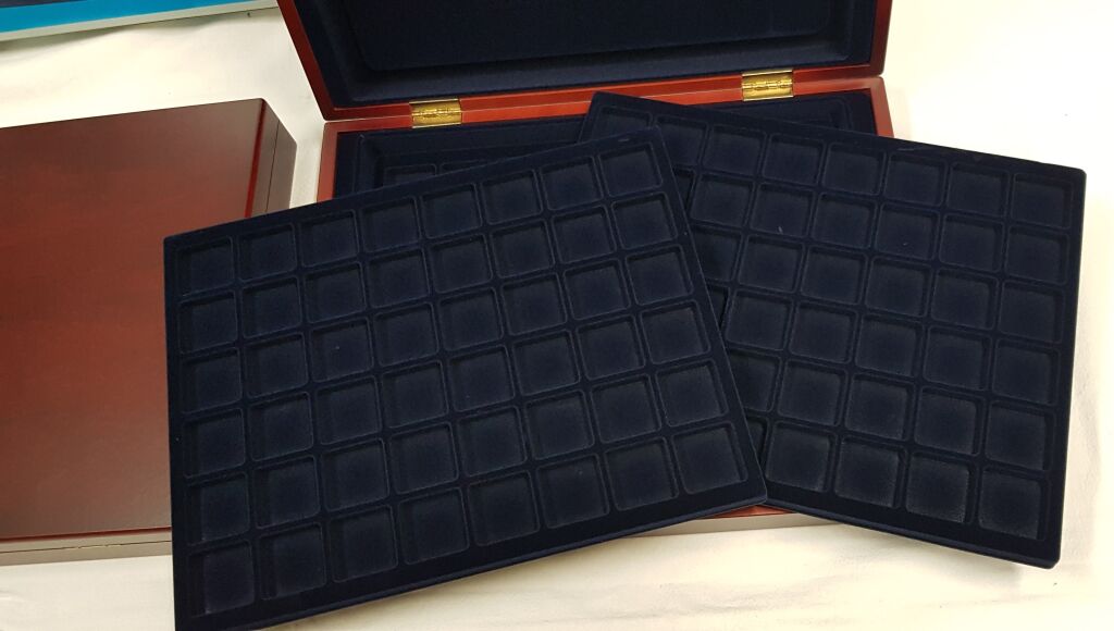MATERIEL - Coffrets pour MONNAIES marque LEUCHTTURM VOLTERA TRIO pour, chacun, 144 pièces au format maxi de 30 mm. Luxueux coffrets bois 34 x 26,5 x 4,8 cm, fermoir par aimant, contenant chacun 3 plateaux velours bleu -