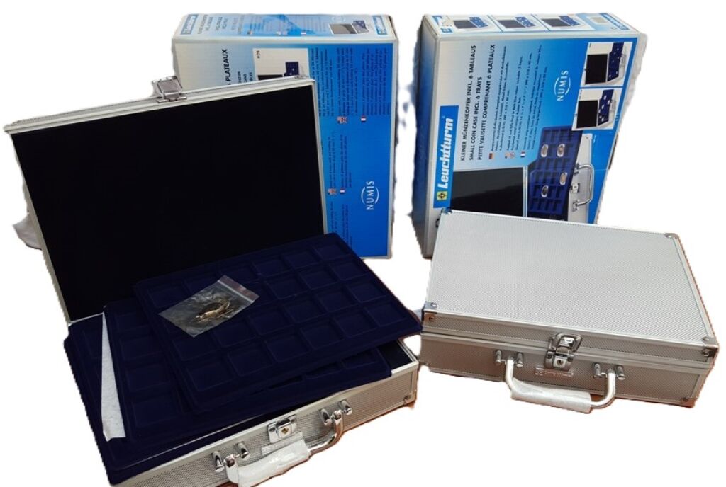 MATERIEL - VALISES A MONNAIES en aluminium de marque Leuchtturm 29 x 21 x 8 cm, contenant chacune 6 plateaux feutrine bleue pour ranger chacune plus d'une centaine de pièces de formats différents - avec poignée et serrure (clefs présentes).