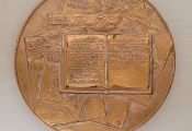 MEDAILLE de table grand module en MÉMOIRE de CINO DEL DUCCA (* ).son buste profil à droite par DROPSY ( ** ) mentions 1899 - 1967 Cino Del Duca - Revers : ses plus gros titres de journaux : " Paris jour, Historia, Intimité, Nous Deux, Mode de Paris, Stop, Télé poche " ; en centre livre ouvert où il est écrit : " Homme de presse et éditeur, célèbre ami des humbles et des Grands, ni l'âge ni la fortune ne devaient changer le cœur généreux de l'enfant pauvre qu'il avait été ".