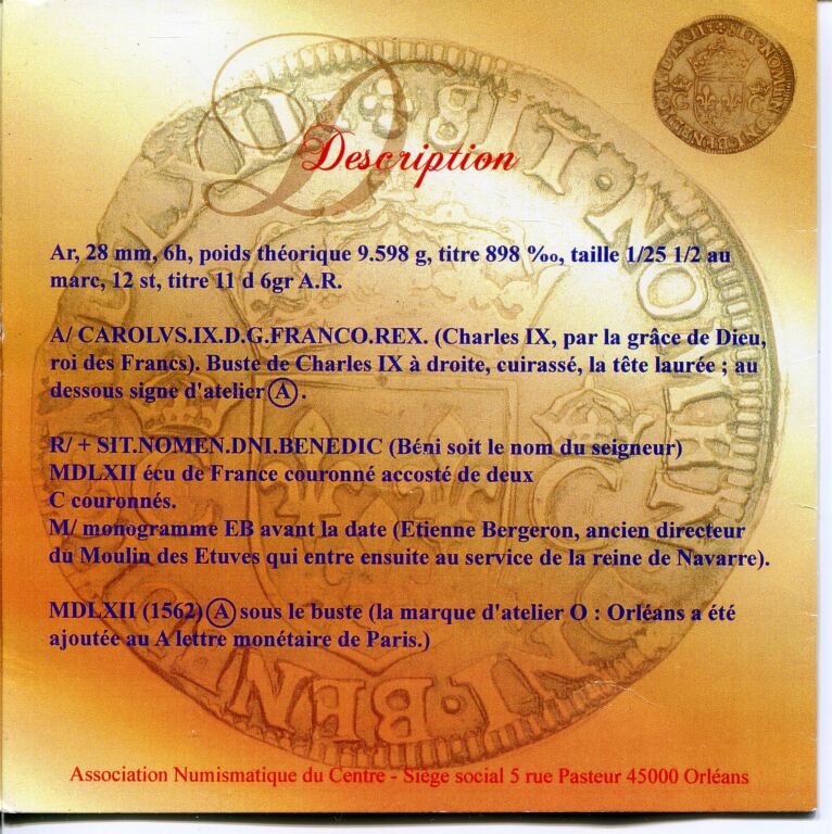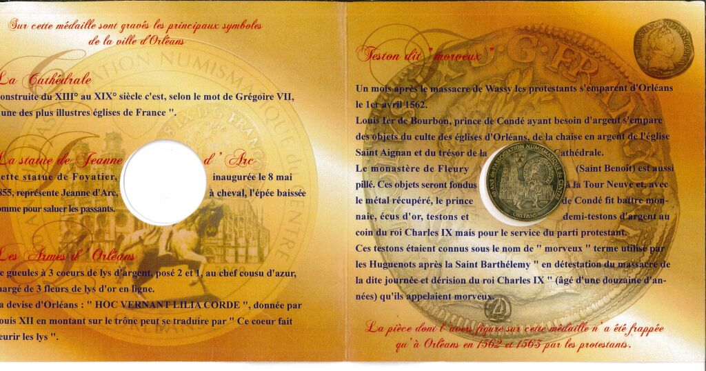 MONNAIE de PARIS - MEDAILLE TOURISTIQUE MONNAIE de PARIS "40e anniversaire de l'association numismatique du centre 1969 / 2009 " - sur blister spécial, série numérotée limité à 200 exemplaires, blister ouvrant avec historique de ville et historique du teston Charles X frappée lors de la révolte des Huguenots en 1562 et 1563 avec le métal récupéré après pillage du monastère de Fleury.