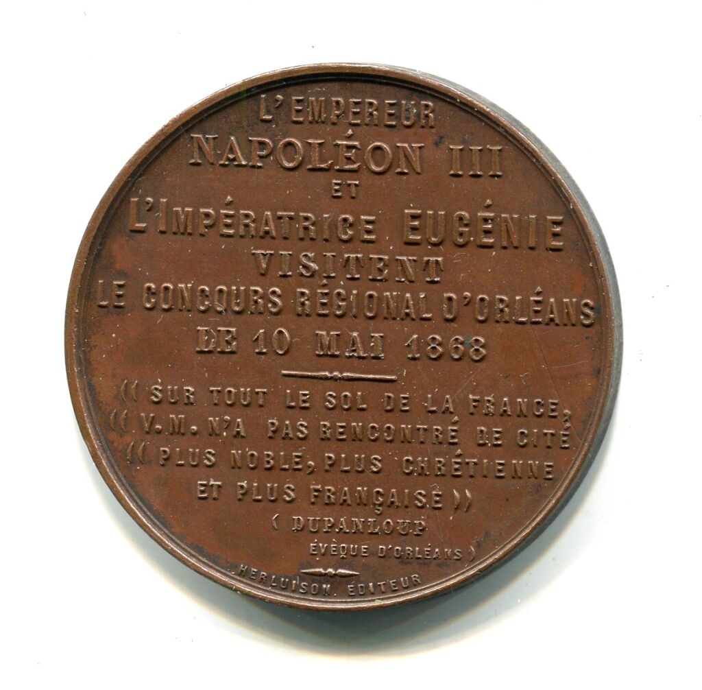 " L'Empereur Napoléon III et l'Impératrice Eugenie visitent le concours régional d'orléans le 10 mai 1868. Sur tout le sol de la France ((V.M. n'a pas rencontré de cité ((plus noble, plus chrétienne et plus française)) / Dupanloup évêque d'orléans ".