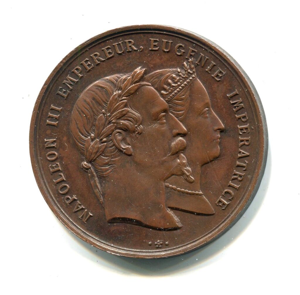 " NAPOLEON III EMPEREUR / EUGENIE IMPERATRICE " - Rare et magnifique médaille de visite - Bustes accolés, profils à droite, du couple impérial, l'empereur tête laurée et l'impératrice diadémée, Herluison éditeur à Orléans. - au revers texte treize lignes :