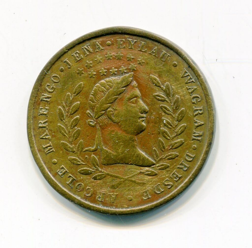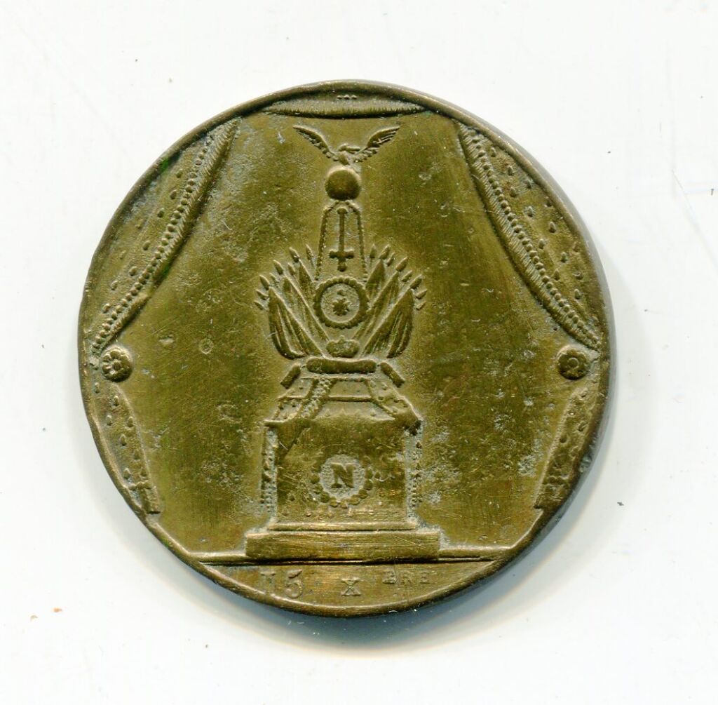 NAPOLEONIDE - Médaille commémorative TRANSLATION des CENDRES de NAPOLEON 1er AUX INVALIDES - ( * ) " en centre, entre 2 palmes de laurier, buste de l'empereur lauré, profil à droite ; au-dessus 12 étoiles ; en pourtour victoires de l'Empereur : "ARCOLE, MARENGO, IENA, EYLAU, WAGRAM, DRESDE - RARE TYPE de Revers : catafalque des invalides surmonté de drapeaux et aigle sur une boule, " N " au-devant : à l'exergue : 15 Xbre (15 décembre). - Laiton 33 mm - 12,38 grammes - TTB