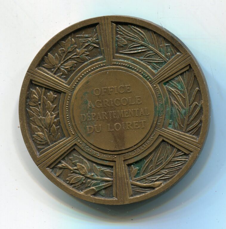 " OFFICE AGRICOLE DEPARTEMENTAL du LOIRET " - Très belle médaille bronze art déco de Robert COCHET, dans un octogone une jeune femme de face, porte une gerbe de blé sur l'épaule - Revers : six rayons en cercle sur palmes, titre en centre.