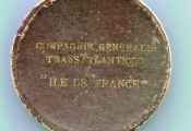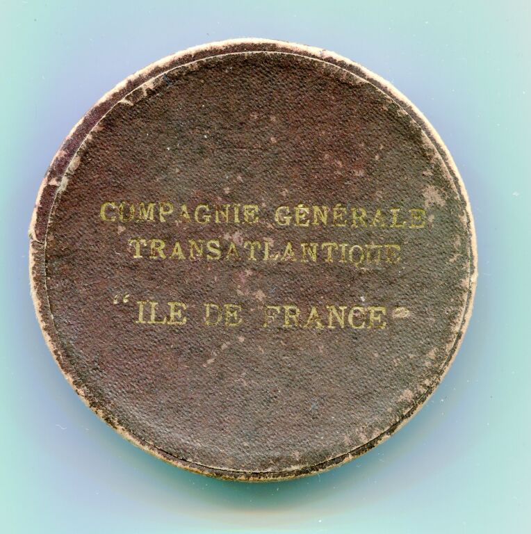 Revers : "C. G. T. French Line Ile de France ", carte maritime Le Havre New York, hublot avec mouettes en centre, au-dessus vue du navire à la mer par bâbord. OEuvre du sculpteur / médailleur Marcel RENARD 1949 - sur la tranche poinçons bronze et corne.