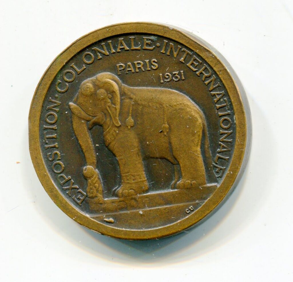 " PARIS / EXPOSITION COLONIALE INTERNATIONALE 1931 ", médaille en cuivre patiné bronze ELEPHANT de profil - Revers : ASIE, tête d'annamite en costume traditionnel, de face, œuvre signée MORLON - 32 mm - 18,87 grammes - TTB (petits chocs listel)