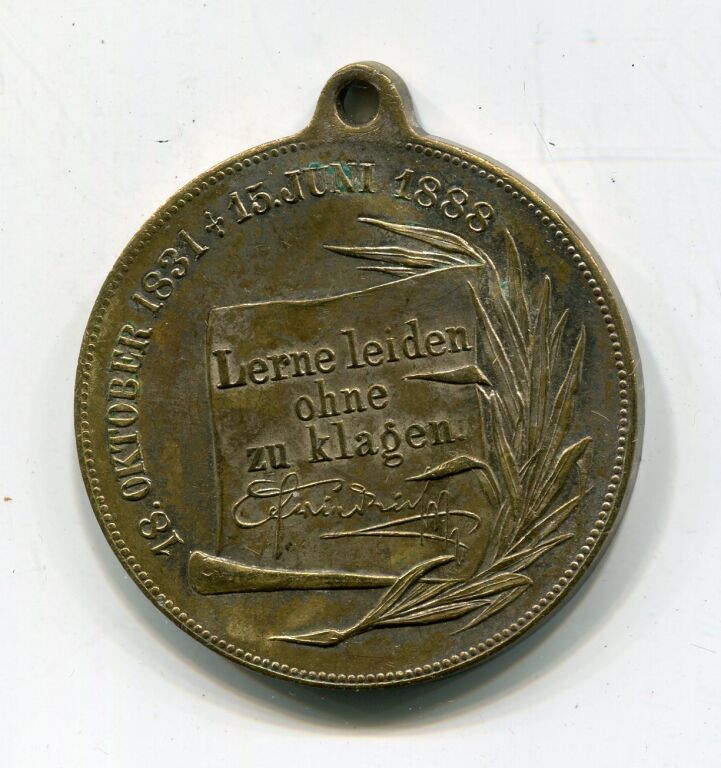 PRUSSE / ALLEMAGNE - FREDERIC III ( * ) - MEDAILLE SOUVENIR de DEUIL, commémorative de la mort du Roi. - " FRIEDRICH DEUTSCHER KAISER KONIG V. PRUSSEN ", Frédéric empereur et roi de Prusse, son buste barbu profil à droite, étoile sous le cou - Revers, en légende circulaire "15 OKTOBER 1831 + 15 JUNI 1888"; en centre, accolé à une grande palme, parchemin déroulé avec texte, ses dernières paroles : "Lerne leiden ohne zu klagen {SIGNATURE} (apprenez à souffrir sans vous plaindre) -